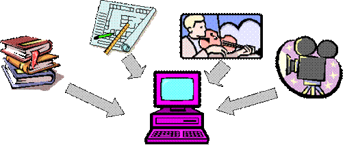 (Il disegno mostra cosa è possibile fare oggi grazie ad un personal computer e il relativo collegamento ad Internet: leggere libri, condividere progetti, ascoltare musica e vedere film, oggi è reso possibile grazie al massiccio potenziamento dei vecchi calcolatori elettronici)