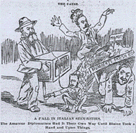 scimmietta, Re Umberto vende noccioline mentre l'americano Blaine (il segretario di stato) gli fa cadere tutta la mercanzia: ecco la visione dell'Italia che protestava contro il linciaggio di New Orleans.