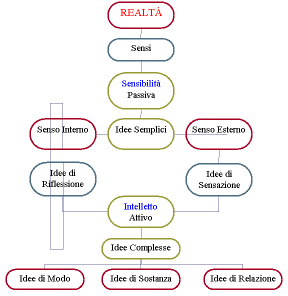 L'empirismo: premessa fondamentale della gnoseologia di Locke è che la conoscenza consiste di idee, pensare significa avere idee, inoltre tutte le idee derivano dall'esperienza, non sono prodotte dall'azione attiva dell'intelletto ma sono il prodotto della facoltà passiva della sensibilità e dell'azione attiva e combinatoria dell'intelletto. Le idee pertanto si dividono in:
