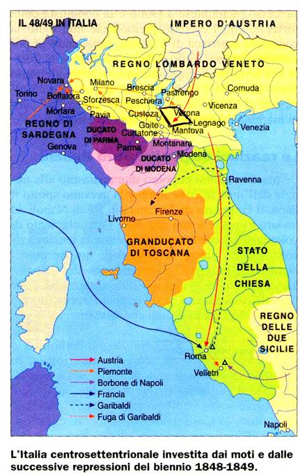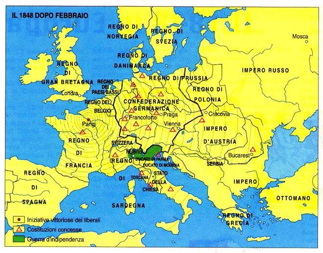 I moti europei ebbero origine proprio nella penisola italiana; infatti il 12 Gennaio moti popolari appoggiati dalla aristocrazia terriera e dalla borghesia ebbero luogo a Palermo, e grazie appunto al massiccio appoggio di tutte le classi sociali, e grazie anche al mancato intervento delle truppe austriache fermate al confine dello stato pontificio da Pio IX, Ferdinando II fu costretto ad impegnarsi alla stesura di una costituzione (29 Gennaio). In seguito a tali avvenimenti, in Toscana, Leopoldo II, spinto dall'opinione pubblica, concesse uno statuto (17 febbraio) ed anche Carlo Alberto, in Piemonte, dovette accettare le pressioni di ministri e consiglieri concedendo a sua volta una costituzione (4 marzo). Nel mezzogiorno d'Italia, e cioè nello stato pontificio, il tiepido riformismo del '47 non placò il malcontento serpeggiante anche per le notizie che arrivavano da tutt'Italia, ed in effetti Pio IX diede spazio ad una riorganizzazione delle strutture statali di tipo laico ed il 13 marzo fu ultimato anche nell'arretrato stato pontificio uno statuto. Solamente i ducati di Parma e Modena ed il Lombardo - Veneto non beneficiarono di tali riforme istituzionali.