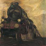 Nel quadro di Bonzagni viene rappresentata la locomotiva in corsa vista da un tipo di prospettiva che sembri ci volesse investire.