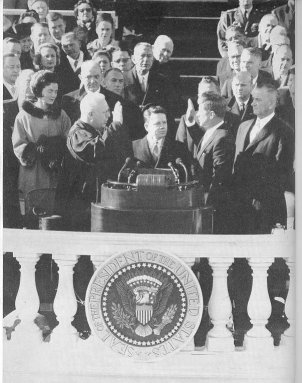 (nella foto: il Presisdente Kennedy durante la cerimonia di insediamento alla Casa Bianca, alle sue spalle il vice Presidente L. B. Johnson)