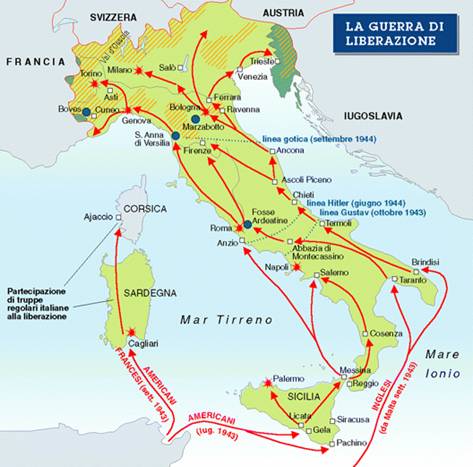 Gli anglo-americani, infine, liberano Roma e Firenze fino a raggiungere, all'iniziare dell'inverno, la Linea gotica (costituita dalle fortificazioni tedesche).