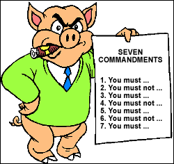 The animals also agreed that no animal shall ever enter the farmhouse, and that no animal shall have contact with humans. This commandments are summarised in the simple phrase: 'Four legs good, two legs bad'. After some time Jones came back with some other men from the village to recapture the farm. The animals fight brave, and they manage to defend the farm. Snowball and Boxer received medals of honour for defending the farm so bravely. Also Napoleon who had not fought at all takes a medal. This is the reason that the two pigs, snowball and Napoleon are often arguing. As Snowball one day presented his idea to build a windmill, to produce electricity to the other animals, Napoleon calls nine strong dogs. The dogs drive off Snowball from the farm, and Napoleon explains that Snowball in fact was co-operating with Mr Jones. He also explains that Snowball in realty never had a medal of honour, that in Snowball was always trying to cover up that he was fighting at the side of Mr Jones. The animals then started with the building of the windmill, and as time went on the working-time went up, whereas the food ration went down. Although the 'common' animals had not enough food, the pigs grow fatter and fatter. The pigs tell the animals that they need more food, for they are managing the whole farm. Again some time later the pigs explain to the other animals that they have to trade with the neighbour farms. The common animals are very upset , because after the revolution, there has been a resolution that no animal shall make trade with a human. But the pigs ensured that there never has been such a resolution, and that this was a evil lye by Snowball. Short after this decision the pigs moved to the farm house. The other animals remembered that there was a commandment that forbids sleeping in beds, and so they go to the big barn to look at the commandments. As they arrive there they can't believe their eyes, the 4th commandment has been changed to: 'No animal shall sleep in bed with sheets'. And also the other commandments were changed: 'No animal shall kill another animal without reason', or 'No animal shall drink alcohol in excess'. Some months there is a heavy storm that destroys the windmill, that is nearly ready. Napoleon accuses Snowball of destroying the mill, and he promises a reward to the animal who gets Snowball. The rebuilding of the mill takes two years. Again Jones attacks the farm, and although the animals defend the farm the windmill is once again destroyed. The pigs decide to build the mill again, and they cut down the food ration. And some day Boxer breaks down. He is sold to a butcher, whereas Napoleon tells the pigs that Boxer was brought to a hospital where he has died. Three years later the mill was finally ready. In this time Napoleon deepens the relations with the neighbour farm, and one day Napoleon even invites the owners of this farm for an inspection. They sit inside the farmhouse and celebrate the efficiency of his farm, where the animals work very hard with the minimum of food. During this celebration all the other animals have meet at the window of the farm, and as they look inside they can't distinguish between man and animal.