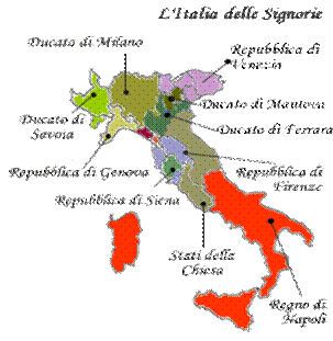 L'Italia era, alla fine del XV secolo, il paese piu' prospero e civile d'Europa, ma anche il piu' debole, a causa del suo frazionamento politico. La ristretta dimensione territoriale e l'effetto disgregante dei conflitti politici condannavano l'Italia degli stati regionali a un incolmabile ritardo storico. Il segnale era ormai chiaro: l'Italia si presentava come terra di conquista per le potenti monarchie nazionali.