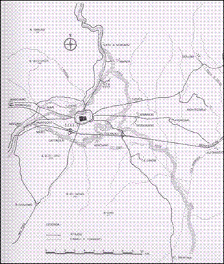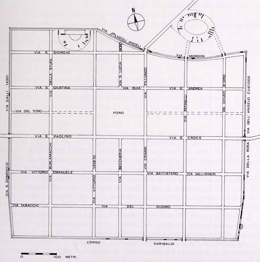 La città romana, edificata in pianura ebbe la possibilità di uno sviluppo urbano secondo linee e forme geometricamente regolari: sostanzialmente un quadrilatero di circa 500m (lati nord e sud) per 650m (lati est e ovest), con uno sviluppo della cinta muraria per più di due chilometri. Questa prima cinta del II secolo a.C., consisteva in un recinto quadrangolare di otto o nove metri di altezza, costruito ad opus quadratum con blocchi di pietra tufacea disposti regolarmente. La città era edificata, com era consuetudine romana, secondo l'intelaiatura di strade parallele alle principali, il cardo e il decumano, che la tagliavano in quattro settori e si incrociavano nel foro, l'attuale Piazza San Michele. In corrispondenza delle stesse si aprivano nella mura le quattro porte di ingresso alla città.