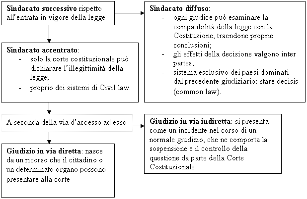 Il modello italiano è prevalentemente orientato verso un giudizio successivo, accentrato e ad accesso indiretto; vi sono però delle eccezioni: