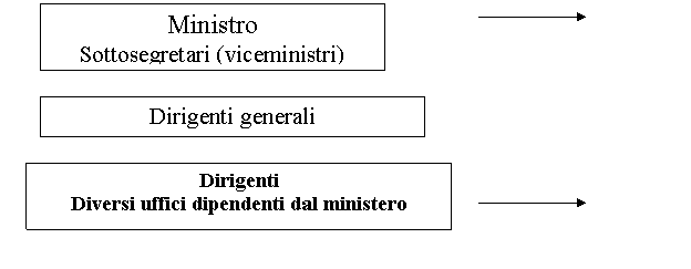 Al vertice della P.A. troviamo i Ministri con i loro Sottosegretari (viceministri). Sotto ai Ministri, troviamo i Dirigenti. Da qualche tempo, sopra i dirigenti troviamo i Dirigenti Generali (ad esempio nelle ASL. In Sardegna le ASL sono 8 e a capo di ciascuna di queste c'è un Dirigente Generale).
