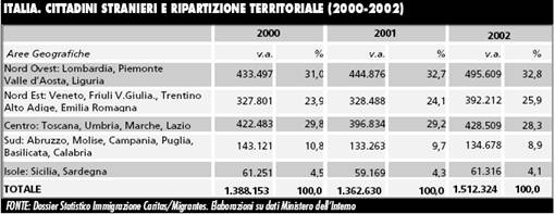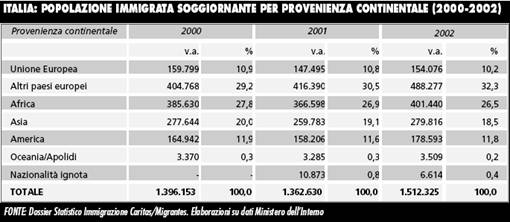 In premessa il Dossier Caritas 2003 sottolinea che "l'immigrazione va considerata non un fenomeno emergenziale, bensì una dimensione strutturale della società". Parrebbe un'affermazione oramai scontata, se non fosse che - giusta l'interpretazione degli autori del Dossier Caritas 2003 - le politiche sull'immigrazione trattano ancora il fenomeno come se si dovesse far fronte ad un evento eccezionale. Già da queste prime considerazioni si palesa, con tutta evidenza, la divisione tra chi ritiene ragionevolmente percorribile solo la strada di una politica incentrata sull'accoglienza e l'integrazione e chi non rinuncia a tentare una politica di selezione dell'immigrazione fino a manifestare scetticismo, o addirittura manifesta ostilità, verso il melting pot. Secondo il Ministero dell'Interno i permessi di soggiorno in vigore alla fine del 2002 erano in Italia 1.512.324: nel corso di un anno l'aumento delle presenze regolari è stato del 10,8% (+149.164 persone, ivi inclusi i nuovi ingressi, i permessi in precedenza non registrati e i minori che hanno ottenuto il soggiorno a titolo personale).
