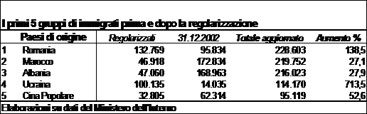 Resta irrisolto il problema di quantificare gli stranieri che si trovano in Italia come clandestini o irregolari. L'ultima regolarizzazione , chiusa l'11 novembre 2002 con la presentazione di 703.000 domande, ha da sola quasi uguagliato il numero complessivo di istanze delle precedenti tre regolarizzazioni degli anni '90. Le domande presentate sono risultate così ripartite: Nord Ovest (233.943, pari al 33,3% del totale), Centro (203.852 e 29,0%), Nord Est (132.291 e 18,8%), Sud (111.216 e 15,9%) e Isole (20.854 e 3,0%). Gli immigrati regolarizzati sono stati in tutto 634.728 . Questa la nuova situazione dei "regolarmente soggiornanti" distinti per nazionalità: