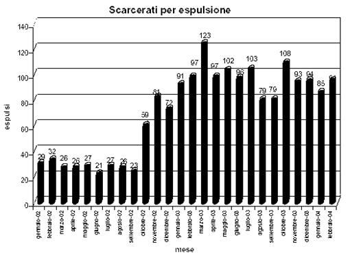 Secondo una ricerca pubblicata dal Sole 24 Ore nel gennaio del 2003, tra il 1999 ed il 2002 sarebbero entrati in Italia 350mila immigrati l'anno, quasi 1000 al giorno, la metà dei quali irregolari . Secondo l'Eurispes, dopo l'ultima regolarizzazione, ci sarebbero in Italia ancora 600mila stranieri <<che non hanno la possibilità o la volontà di regolarizzare la loro presenza>> . Un dato comunemente associato al fenomeno degli ingressi e dei soggiorni illegali è quello che si riferisce all'attività repressiva: nel 2002, secondo il Ministero dell'Interno, sono stati 149.783 i provvedimenti di allontanamento dal territorio nazionale o di divieto ad entrarvi: si tratta di 43.795 respingimenti (di cui l'86% alle frontiere), di 42.245 espulsioni eseguite (di cui il 58,7% con accompagnamento alla frontiera e il 40,3% mediante riammissione nel Paese d'origine in base agli accordi stipulati), di 53.125 espulsioni intimate e di 10.618 ordini del questore, per un totale di 88.501 persone effettivamente allontanate dall'Italia. Senza dubbio l'entrata in vigore della legge 189/2002 (c.d. legge Bossi-Fini) ha determinato un iniziale incremento degli allontanamenti. In particolare, secondo i dati forniti dal Dipartimento dell'Amministrazione Penitenziaria, a partire dall'entrata in vigore della legge sono aumentate sensibilmente le scarcerazioni per espulsione disposte nei confronti di detenuti ristretti negli Istituti penitenziari