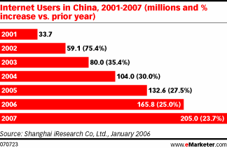 L'aumento in un anno è stato del 61 per cento, segno evidente del boom che sta avvenendo in questo periodo. Certo è che, se pensiamo che la popolazione cinese supera di gran lunga il miliardo di persone, ci accorgiamo che i navigatori della rete al di là della Grande Muraglia non sono poi tanti: solo il 3,6% dei cinesi si connette. Bisogna però considerare che i cinesi hanno potuto scoprire la Rete solo nel 1994 e che il trend di crescita mostra sempre con maggior forza la direzione che si è presa.