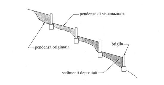 briglie, la cui introduzione rappresenta una serie di sbarramenti che non appena realizzati creano degli invasi tra un manufatto ed il successivo e che col tempo vengono colmati dal materiale solido trasportato dalla corrente (sedimenti depositati). La conseguente riduzione della pendenza media del fondo dell'alveo conduce alla classica sistemazione a gradoni (Figura 1.1.1).