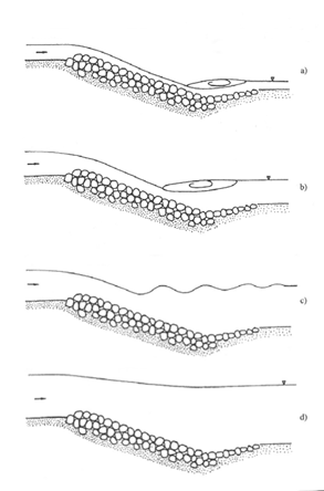Nella maggior parte dei casi applicativi la pendenza della rampa in pietrame è più elevata di quella dell'alveo in cui viene inserita, che spesso è un corso d'acqua di tipo fluviale (tipicamente a debole pendenza). Si possono presentare, perciò, le seguenti configurazioni del pelo libero (Figura 1.3.1):