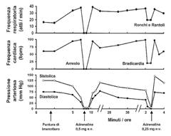 se necessario somministrare adrenalina i.m. o s.c. in dose 0,3-0,5 ml di soluzione 1:1000 ripetibile dopo 10 min; può essere somministrata e.v. diluita 1:10.000 o 1:100.000 solo con