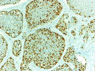 Nell immagine sottostante è un caso di carcinoma adenoidocistic dedifferenziato colorato con il marcatore di proliferazione Ki67. Le cellule con nucleo marrone sono le cellule in attiva replicazione.