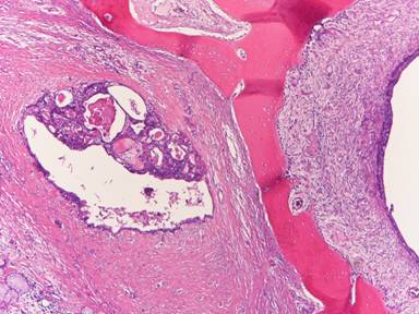 Nell immagine sottostante è riportato un caso di carcinoma mucoepidermoide a basso grado che infiltra il tessuto osseo, per ricordare che anche le forme di basso grado hanno capacità invasiva. L intervento chirurgico tempestivo è importante.