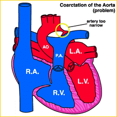 Ha un'incidenza del 6 - 9% delle cardiopatie congenite e consiste in una stenosi dell'aorta a livello dell'istmo ( distalmente all'origine dell'arteria succlavia sinistra ) con conseguente ostacolo al flusso ematico e sviluppo di circoli collaterali ( aorta - succlavia - mammaria -intercostali - aorta ) per bypassare la stenosi.