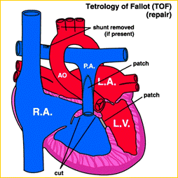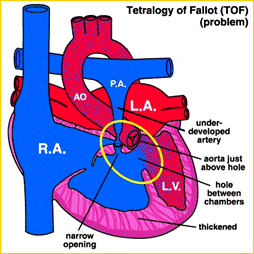 E' una cardiopatia abbastanza frequente ( circa 10% ) caratterizzata da quattro malformazioni: stenosi polmonare infundibolare, ipertrofia ventricolare destra ( conseguenza della stenosi suddetta), destroposizione dell'aorta che origina in parte dal ventricolo sinistro ed in parte da quello destro, ed infine difetto del setto interventricolare. Ciò determina uno shunt destro - sinistro con passaggio di sangue non ossigenato nel circolo sistemico ( e conseguente cianosi ) sia attraverso il difetto interventricolare sia attraverso l'aorta. I bambini affetti da tetralogia di Fallot presentano cianosi e possono andare incontro a crisi anossiche cerebrali con convulsioni quando, per l'ulteriore incremento della pressione polmonare, aumenta lo shunt destro - sinistro con ulteriore desaturazione del sangue arterioso che fluisce al cervello.