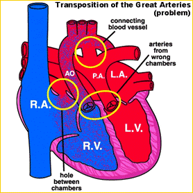 Ha un'incidenza del 10% tra le cardiopatie congenite e consiste in un'inversione dell'aorta e dell'arteria polmonare le quali originano rispettivamente dal ventricolo destro e da quello sinistro. Questa malformazione è molto grave ed incompatibile con la vita extrauterina se non fosse presente un mixing delle due circolazioni, sistemica e polmonare, dato da una pervietà del dotto arterioso o del forame ovale, tale da permettere una sufficiente ossigenazione del sangue arterioso. La sintomatologia è caratterizzata da cianosi non appena il dotto di Botallo si chiude ( in genere dopo 48 ore di vita ) e pertanto è necessario somministrare prostaglandine per evitare la chiusura del dotto arterioso ed effettuare prontamente una procedura cardiologica interventistica chiamata Rashkind che consiste nella dilatazione con un palloncino della pervietà del forame ovale. L'intervento chirurgico può essere costituito dalla correzione fisiologica ( intervento di Senning, intervento di Mustard ) in cui si attua un'inversione dei flussi a livello striale in modo tale da compensare l'inversione ventricolo - arteriosa data dalla malformazione, ma attualmente è ampiamente preferita la correzione anatomica chiamata " switch ", in cui si ristabiliscono le corrette connessioni ventricolo sinistro - aorta e ventricolo destro - arteria polmonare.
