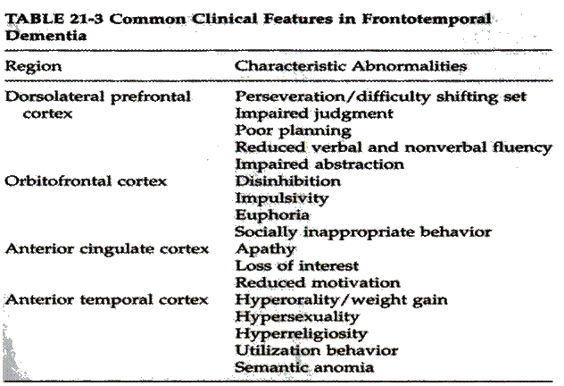 La demenza fronto-temporale propriamente detta coinvolge primitivamente le strutture prefrontali e temporali ma esistono soggetti con un coinvolgimento prevalentemente prefrontale che avranno disturbi del comportamento e saranno apatici, abulici, inerti, che non si importano neanche di un parente che sta male, o disinibiti moriatici(a seconda delle porzioni della corteccia frontale coinvolte), e soggetti con un coinvolgimento prevalentemente temporale che saranno disfasici piuttosto che colpiti da disturbi comportamentali.