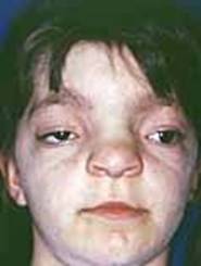 Questo è un iperteleorbitismo cioè una aumentata distanza tra le orbite. Cioè vuol dire che esiste un problema fronto-nasale da aumentata pneumatizzazione dell etmoide o della crista galli o altro. Molto spesso questi pazienti sono intelligenti; se si trovano dei bambini meno intelligenti è colpa dei genitori che non li fanno andare a scuola o li tengono emarginati dalla societ . Loro non hanno grandi problemi, a meno che non abbiano avuto dei lunghi periodi di ipertensione endocranica non trattata, ma è molto difficile perché in genere c è sempre un compenso.