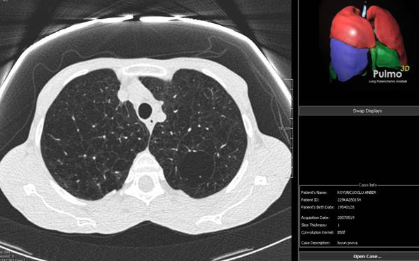 Le immagini vengono analizzate con una Workstation dedicata, non utilizzata nella routine clinica (Leonardo Siemens), che dispone, tra l'altro, di un software dedicato alla identificazione automatica dei noduli e alla loro valutazione volumetrica computerizzata (LungCare software Siemens). Le immagini, vengono archiviate in un server dedicato, che risponde alla normativa vigente per la sicurezza dei dati. Il protocollo non prevede l'impiego routinario della tecnica di "contrast enhancement" per la valutazione di noduli solidi. La lettura viene eseguita con valori di finestra omogenei: -650/1500-1600 per il parenchima e 25/350 per il mediastino. I risultati della TC vengono valutati su monitor ad alta definizione indipendentemente ed in doppio cieco da due radiologi.