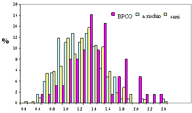 Tabella 4 - Distribuzione dei soggetti a rischio (con FEV %<90) e dei soggetti sani rispetto alle caratteristiche cliniche e corrispondenti OR e intervalli di confidenza al 95%