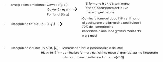 Tipi di emoglobina embrionale, fetale e adulta: due gruppi di geni sono coinvolti nella produzione di emoglobina che ricordiamo essere un tetramero composto da quattro catene globiniche, questi geni sono localizzati sul braccio corto del cromosoma 16 e del cromosoma 11.