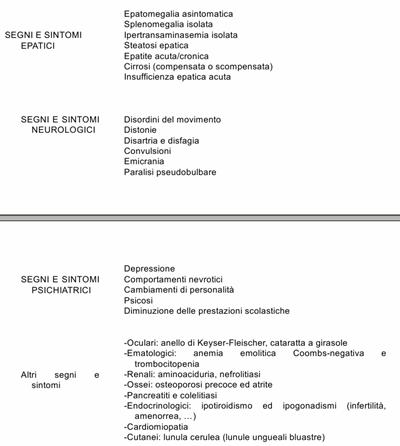 segni di interessamento neurologico tremori, distonie, disartria, . . .;