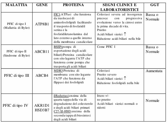 Disturbi del trasporto, della secrezione, della coniugazione e della biosintesi degli acidi biliari: Le PFIC (Progressive Familiar intrahepatic cholestasis) sono delle patologie in cui il difetto di proteine, implicate nel trasporto canalicolare degli acidi biliari o nella loro sintesi, determinano l'insorgenza di colestasi ad andamento progressivo, se ne conoscono 4 forme: