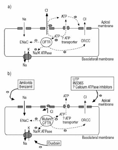 Poiché l'acqua segue il movimento dei Sali, il flusso netto d'acqua previsto andrà dal lume delle vie aeree alla sottomucosa e sarà maggiore attraverso l'epitelio con fibrosi cistica. L'aumentato riassorbimento di Na+ da parte delle cellule, nella fibrosi cistica, si associa a un aumento della conduttanza per il Na+ sensibile all'amiloride attraverso la membrana apicale (luminale) e a un aumento dei siti Na+-K+ATPasi sulla membrana basolaterale. La conduttanza del Cl− cAMP-mediata della membrana apicale, associata al regolatore trans membrana della FC (CFTR), non è funzionale nell'epitelio dei pazienti con fibrosi cistica; in compenso, è presente una conduttanza del Cl− alternativa, attivata dal calcio, nelle cellule normali e in quelle con FC. Si postula che nella FC le cellule abbiano una capacità limitata di secernere il Cl− e riassorbano il Na+ in quantità eccessiva, limitando la disponibilità di acqua per idratare secrezioni che quindi possono essere eliminate dal lume delle vie aeree.