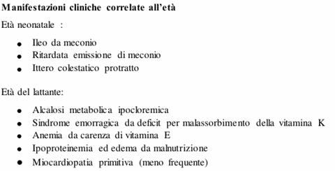 Insufficienza pancreatica esocrina (~85%), i cui sintomi comprendono evacuazioni frequenti di feci abbondanti ed oleose e mancato aumento ponderale;