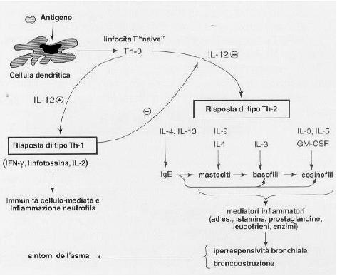 I mediatori comprendono l'istamina e i prodotti del metabolismo dell'acido arachidonico (i leucotrieni e i trombossani, entrambi in grado di aumentare transitoriamente l'iperreattività delle vie aeree). I cisteinil-leucotrieni, il LTC4 e il LTD4, sono i più potenti broncocostrittori mai studiati nell'uomo. L'attivazione della risposta allergica da parte delle cellule T è un evento chiave. Le cellule T e i loro prodotti di secrezione (le citochine) mantengono l'infiammazione delle vie aeree. Le citochine prodotte da un gruppo specifico di linfociti, le cellule T CD4+ Th2, favoriscono la crescita e la differenziazione delle cellule, le attivano e le inducono a migrare nelle vie aeree, dove ne prolungano la sopravvivenza. Le principali citochine coinvolte comprendono l'interleuchina (IL)-4, che è necessaria per la produzione di IgE; l'IL-5, che è un fattore chemiotattico per gli eosinofili e il fattore stimolante le colonie di granulociti-macrofagi, simile all'IL-5 per i suoi effetti sugli eosinofili ma meno potente.