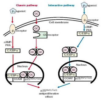 L'associazione tra glucocorticoidi e farmaci β -agonisti è largamente impiegata nel trattamento dell'asma (Greening et al., 1994; Shrewburg et al., 2000). I glucorticoidi inibiscono la proliferazione delle cellule muscolari lisce bronchiali attraverso la down-regulation dell'espressione della ciclina-D1 e la fosforilazione della proteina del retinoblastoma (Fernandes et al., 1999), mentre i β2-agonisti inibiscono la proliferazione cellulare mediante un aumento dei livelli intracellulari di cAMP (Stewart et al., 1997). Lo studio condotto da Roth et al. (2002) ha messo in evidenza il sinergismo d'azione della combinazione tra glucorticoidi e β - agonisti (Figura 8), che si realizza mediante l'attivazione sia del recettore glucorticoide, sia di C/EBP-α (CCAAT-enhancer binding protein). Infatti la stimolazione contemporanea del recettore glucorticoide e di C/EBP-α produce un'azione antiproliferativa più rapida ed efficace, attraverso un aumento dell'espressione di p21(Waf1/Cip1), una proteina inibitoria che controlla il ciclo cellulare (Rüdiger et al., 2002; Cram et al., 2008).