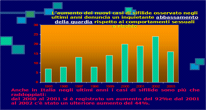 Proprio in quest'ultimi anni l'aumento dei casi di sifilide è stato notevole soprattutto intorno al2000 e al 2002, tra il 2000d il 2001 c'è stato un >del92% mentre tra il 2001 ed il2002 un ulteriore >del44%, circa 10 anni fa c'è stato un vero e proprio raddoppio.