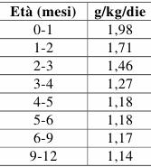 Le proteine animali hanno un valore biologico superiore a quelle vegetali. Il valore biologico delle proteine può essere determinato misurando l'Età (mesi) g/kg/die.