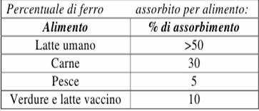 Ferro: In età pediatrica il bambino tende ad espandere continuamente i suoi tessuti e ad aumentare quindi il volume di sangue, proprio per quest'ultimo motivo diventa fondamentale un adeguato apporto di ferro, essenziale per la costituzione dell'emoglobina e dei globuli rossi in generale; non è raro infatti che nel bambino si riscontri un'anemia sideropenica dovuta al divario tra ritmo di espansione ematica e quantità di ferro a disposizione.