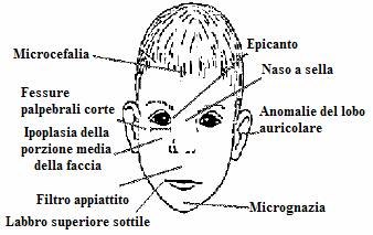 Dismorfismi faciali e craniali: microcefalia, microftalmia, alterazioni mandibolari, naso a sella, ossa palatine prominenti, labbro leporino, denti piccoli, fessure palpebrali corte, epicanto, ipoplasia del mascellare; si osservano in relazione al consumo di alcol nel primo trimestre (vedi Fig. 3.3).