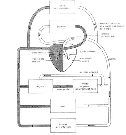 Fig 1- 1 Rappresentazione schematica del sistema circolatorio: sono evidenti i due circoli (grande e piccolo) e i collegamenti tra il cuore e i principali organi.