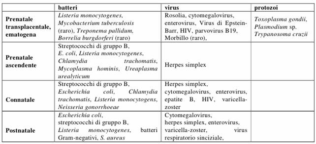 Eziologia: streptococco di Gruppo B (GBS, soprattutto tipo III), E.coli e Listeria monocytogenes provocano il 75% delle meningiti neonatali. Anche gli enterococchi, gli streptococchi non-enterici di Gruppo D, gli streptococchi α-emolitici e altri germi enterici gram - (p. es., Klebsiella sp, Enterobacter sp, Citrobacter diversus) sono patogeni importanti. H. influenzae tipo b, Neisseria meningitis, e S.pneumoniae sono stati riportati sempre più frequentemente come cause di meningite neonatale.
