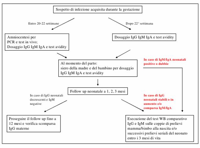 Screening e terapia: in Italia si effettua il test a tutte le gravide al III trimestre, con profilassi alle positive e nei casi di presunta infezione tramite Ig specifiche e vaccino. L'allattamento al seno non è controindicato.