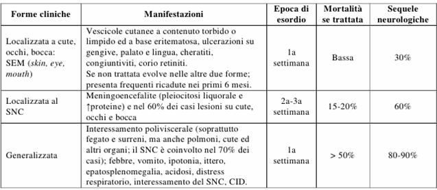 Le manifestazioni cliniche, di solito, si hanno tra la 1a e la 2a sett. di vita; tuttavia, i sintomi possono non comparire fino alla 4a sett. di vita. Il segno patognomonico dell'infezione è rappresentato da vescicole cutanee, che, se non trattate, frequentemente inducono entro 7-10 giorni una progressiva e più grave forma di malattia. Comunque, fino al 45% dei neonati infetti non presenta inizialmente vescicole cutanee; solitamente questi neonati hanno una malattia localizzata al SNC. Altri segni di infezione, che possono essere presenti singolarmente o in associazione, comprendono l'instabilità termica, la letargia, l'ipotonia, la difficoltà respiratoria (apnea o polmonite), le convulsioni, l'epatite e la coagulazione intravascolare disseminata (CID).