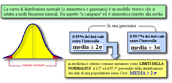 Questo modello è particolarmente utile, in quanto possiamo impiegarlo conoscendo soltanto la media e la deviazione standard. Infatti, in una gaussiana il 95% dei dati cade nell'intervallo media ± 2 volte la deviazione standard.