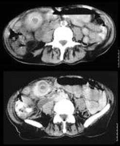 Fig 5 Tac addome superiore . intensa reazione infiammatoria pericolecistica e perdita dell'interfaccia tra colecisti e tessuti circostanti