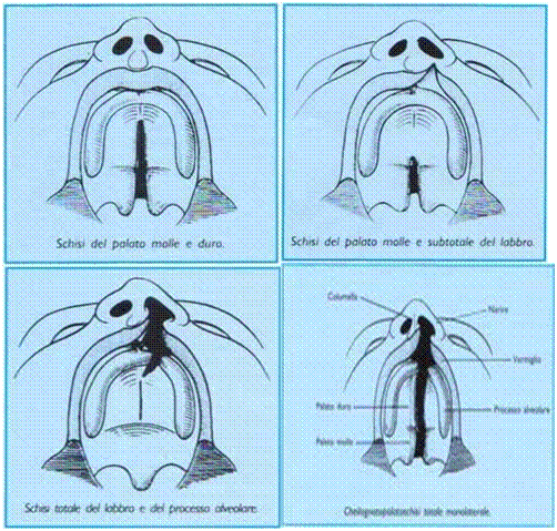 Queste non sono compatibili con la vita perché non c è la porzione cerebrale. Poi ci sono dei casi in cui è coinvolto solo il palato molle, altri in cui è completo ecc .
