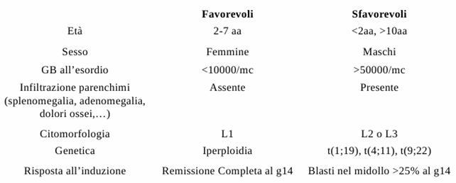 La conoscenza di tutti questi fattori è molto utile nel valutare la prognosi del paziente. I fattori prognostici sono parametrici clinici e/o biologici presenti nel paziente alla diagnosi e correlati all'outcome che vengono utilizzati per stratificare i pazienti in fasce di rischio al fine di modulare l'aggressività del trattamento. I fattori prognostici sono suddivisi in favorevoli e sfavorevoli e sono riportati nella tabella.