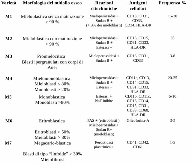 differenziazione dei blasti. Le principali reazioni citochimiche sono riportate