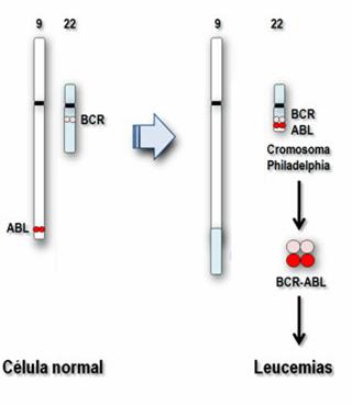 t(9;22)(q34;q11). In questo modo si forma un gene di fusione, bcr/abl, la cui