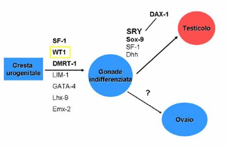 Il processo viene modificato da un fattore di determinazione del sesso codificato dal gene SRY, il quale durante la vita embrionale, intorno alla 4-5 settimana, induce la differenziazione delle cellule del Sertoli. Le cellule del prosertoli si sviluppano nei cordoni sessuali presenti nella cresta genitale. Inoltre il fattore del SRY induce la formazione delle cellule del Leydig nella midollare (ossia nel mesenchima) della cresta genitale.